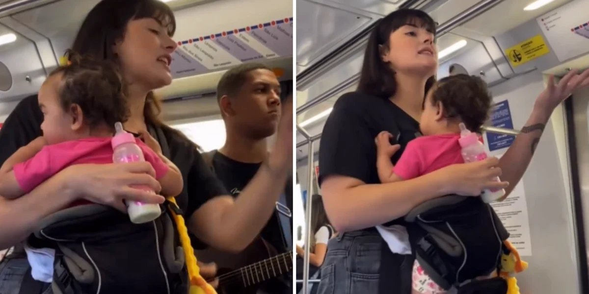 Mãe leva fé e esperança a passageiros do metrô de Porto Alegre com bebê no colo.